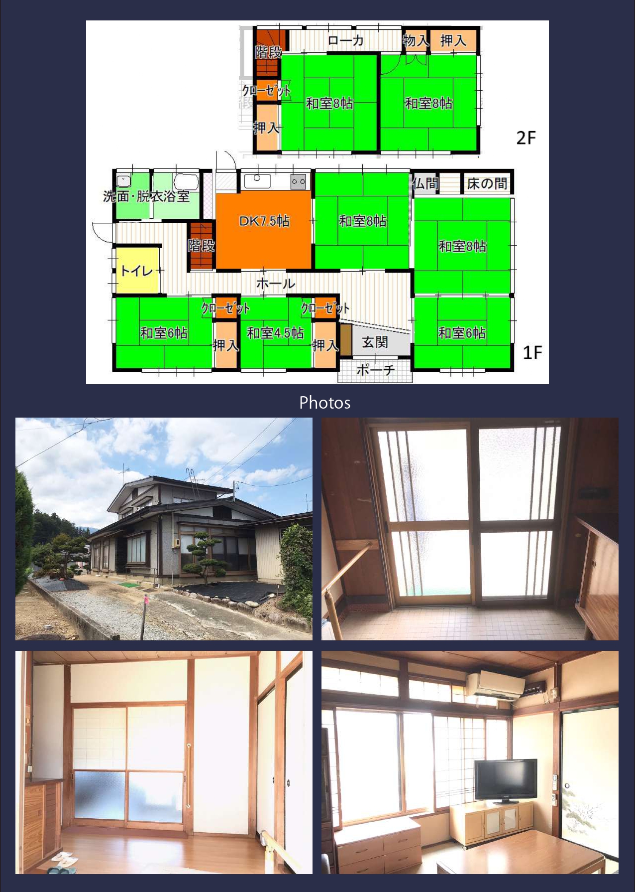 1977年築の建物140㎡2階建の7DK、敷地611㎡(185坪)。770万円。町中物件。