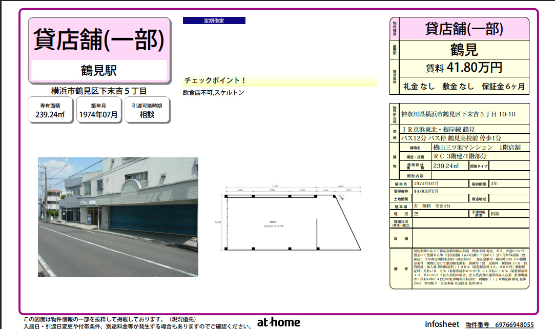 末吉中学校入口信号五差路そばにある239㎡の一階貸店舗。賃料418,000円、共益費44,000円。