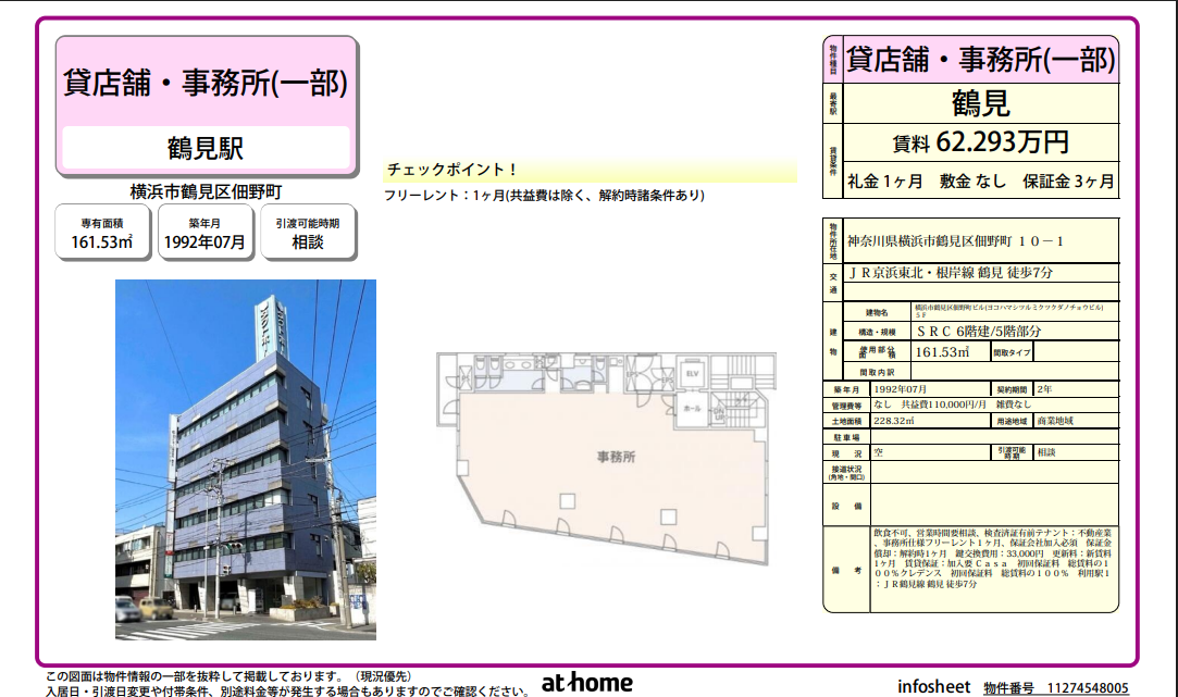 鶴見郵便局と小学校の間、72.1㎡、賃料+共益費:213,400円。