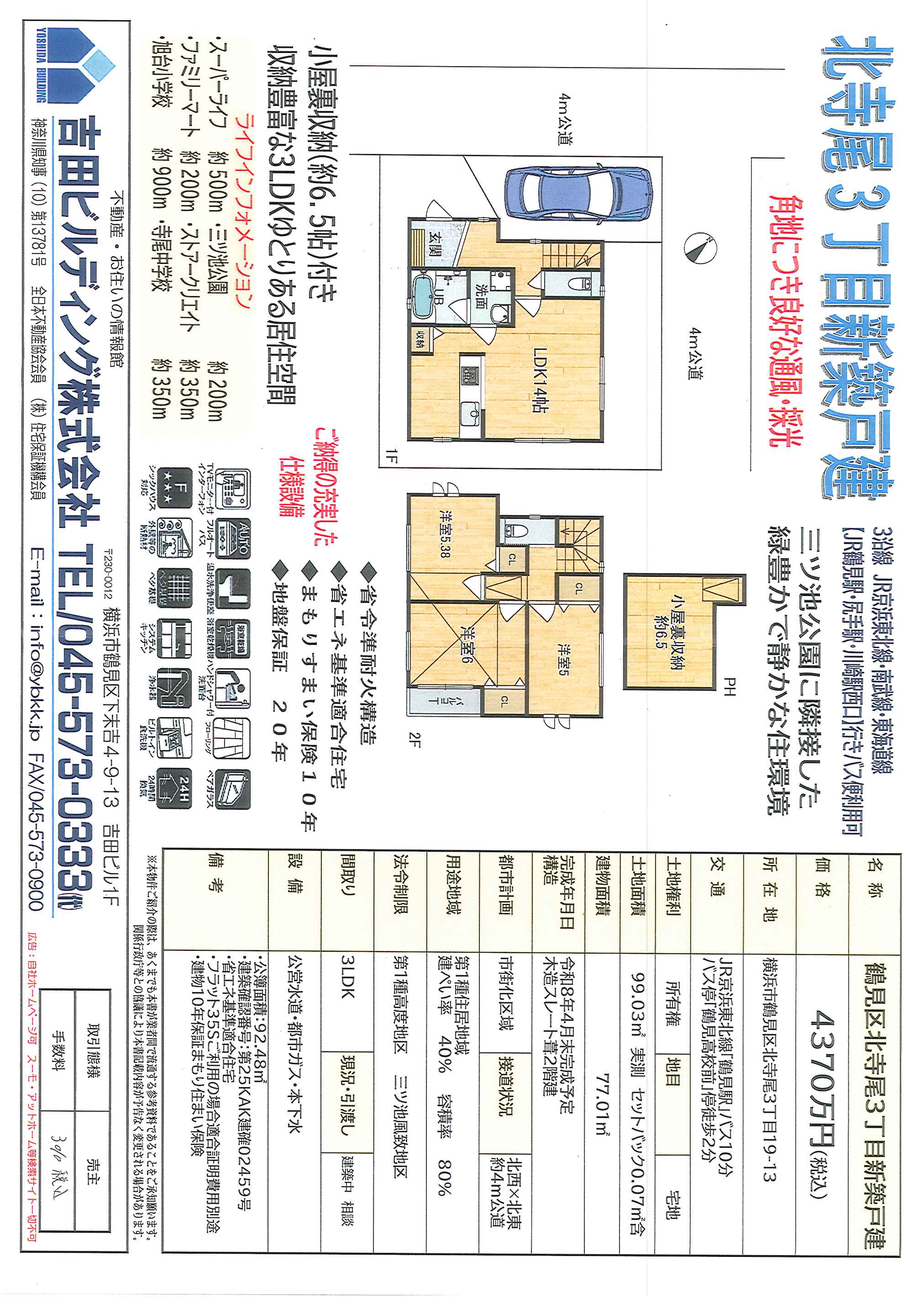 三ッ池公園南門近くの閑静な住宅地の角地に建つ新築。 準耐火構造の省エネ基準適合住宅。敷地99㎡、建物77㎡、4,370万円